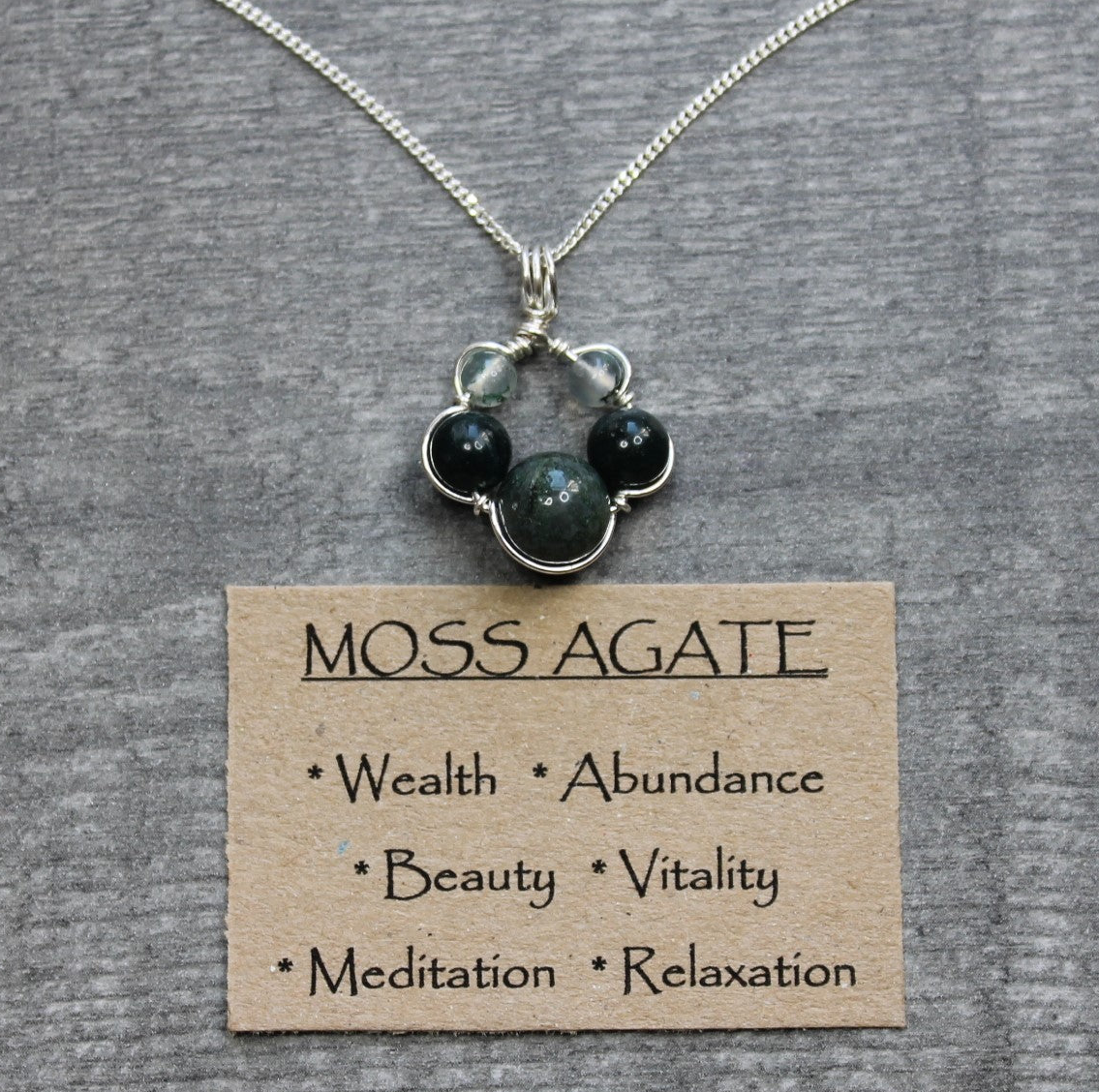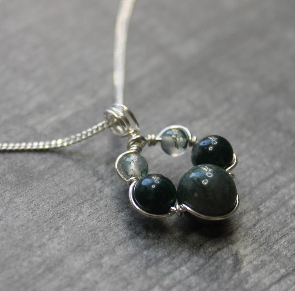 Each pendant is handmade to order, the beads are wrapped in place with sterling silver wire and hung on a sterling silver curb chain (choose from 16" or 18").
