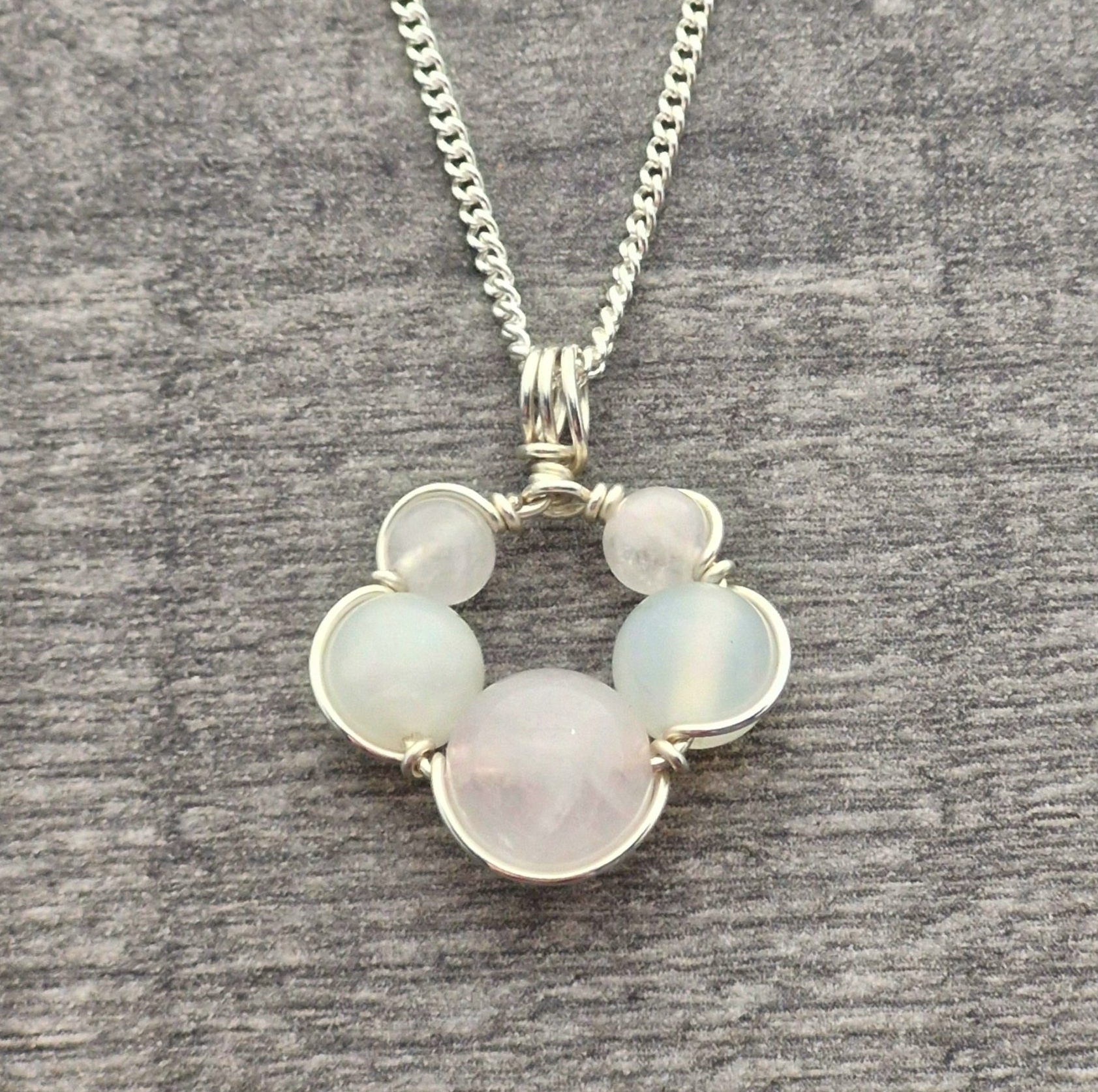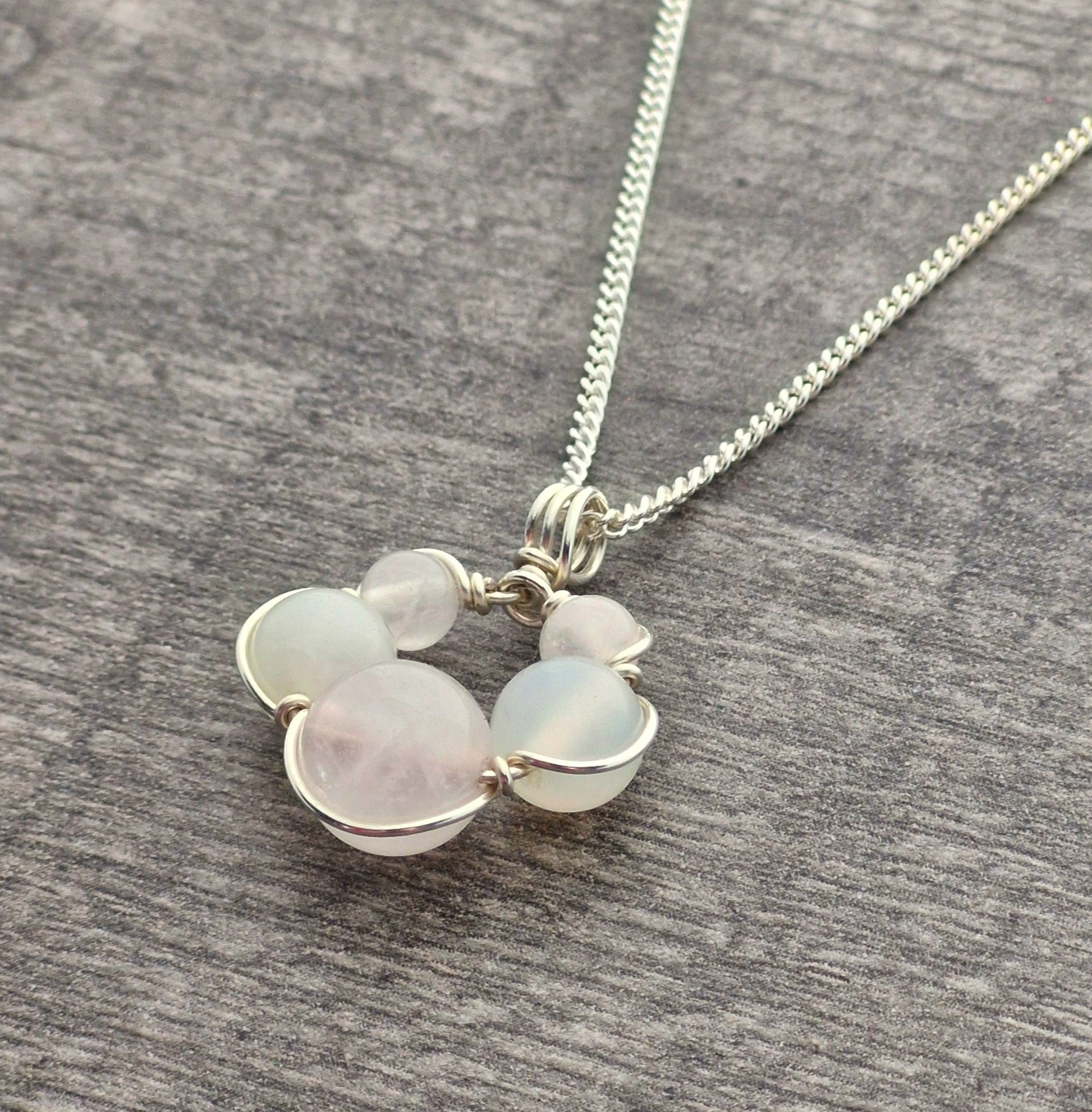 Each pendant is handmade to order, the beads are wrapped in place with sterling silver wire and hung on a sterling silver curb chain (choose from 16" or 18").